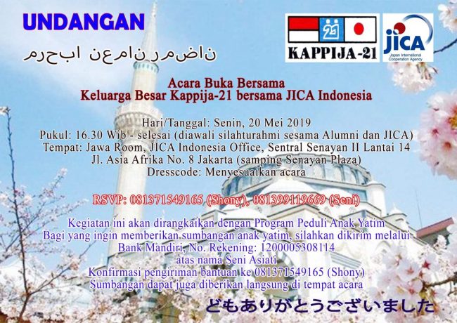 Jakarta – Bersempena bulan penuh rahmat, bulan puasa Ramadhan 1440 Hijriah (2019 Masehi), Keluarga Alumni Program Persahabatan Indonesia Jepang Abad 21 (Kappija-21) akan menyelenggarakan acara berbuka bersama pada hari Senin, 20 Mei 2019 mendatang di Gedung Sentral Senayan II Lantai 14, Jl. Asia Afrika No. 8 Jakarta (samping Senayan Plaza) Jakarta Pusat. Pada acara yang akan digelar di ruang Jawa Room, di gedung tersebut, akan hadir juga para pimpinan dan staf the Japan International Cooperation Agency (JICA) Indonesia.