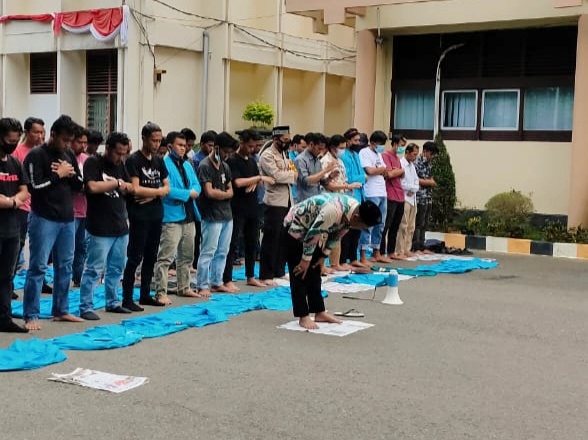 Tampak yang mengikuti shalat zuhur berjamaah bersama mahasiswa, Kapolres Langsa, AKBP Giyarto, SH, SIK, beserta sejumlah anggota DPRK dan Satpol PP.